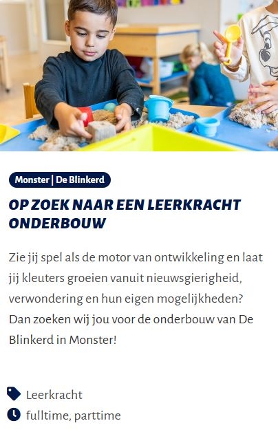 Ben jij geïnteresseerd om bij ons te bouwen aan de toekomst? Of ben je nieuwsgierig hoe werken op De Blinkerd eruit ziet? Kijk in onderstaand filmpje een dag met ons mee. Wie weet ben jij de nieuwe collega die we zoeken. Op deze pagina vind je de actuele vacatures.